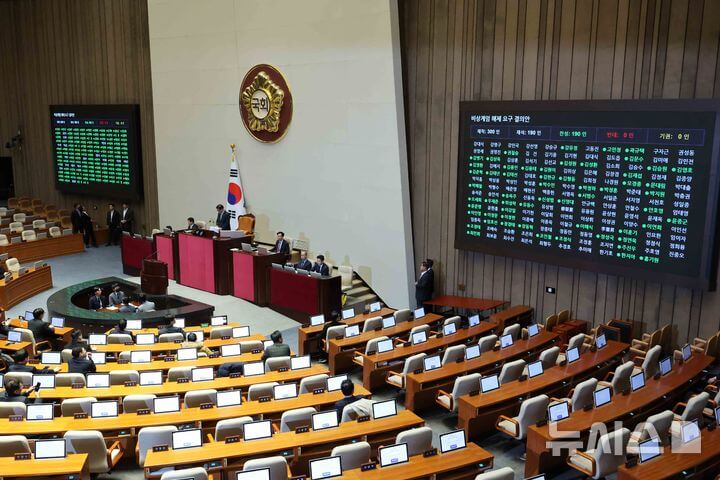 국회는 긴급히 회의를 열어 '비상계엄 해제 요구 결의안'을 발동하고 재석 의원 190명의 전원 찬성으로 가결했습니다.